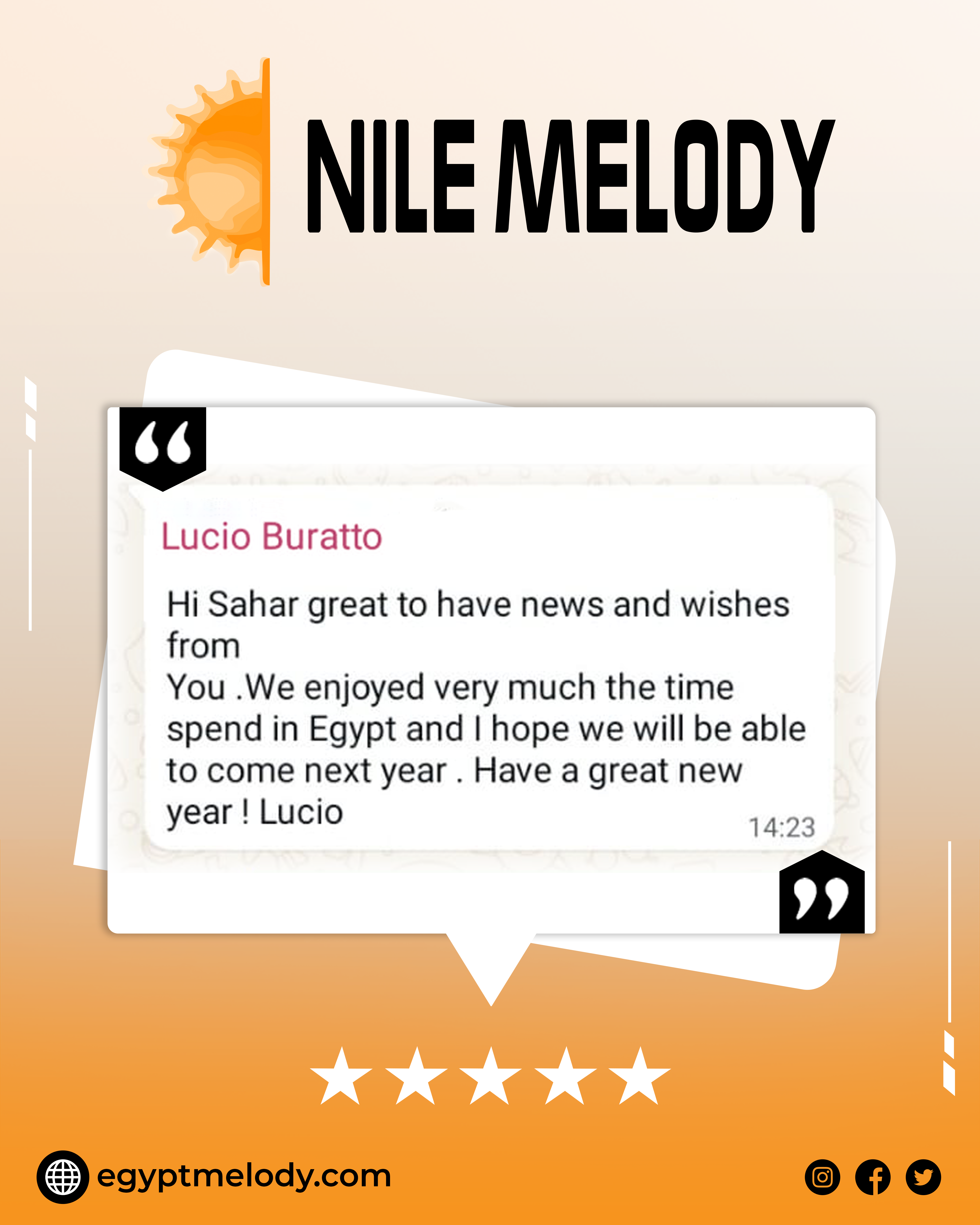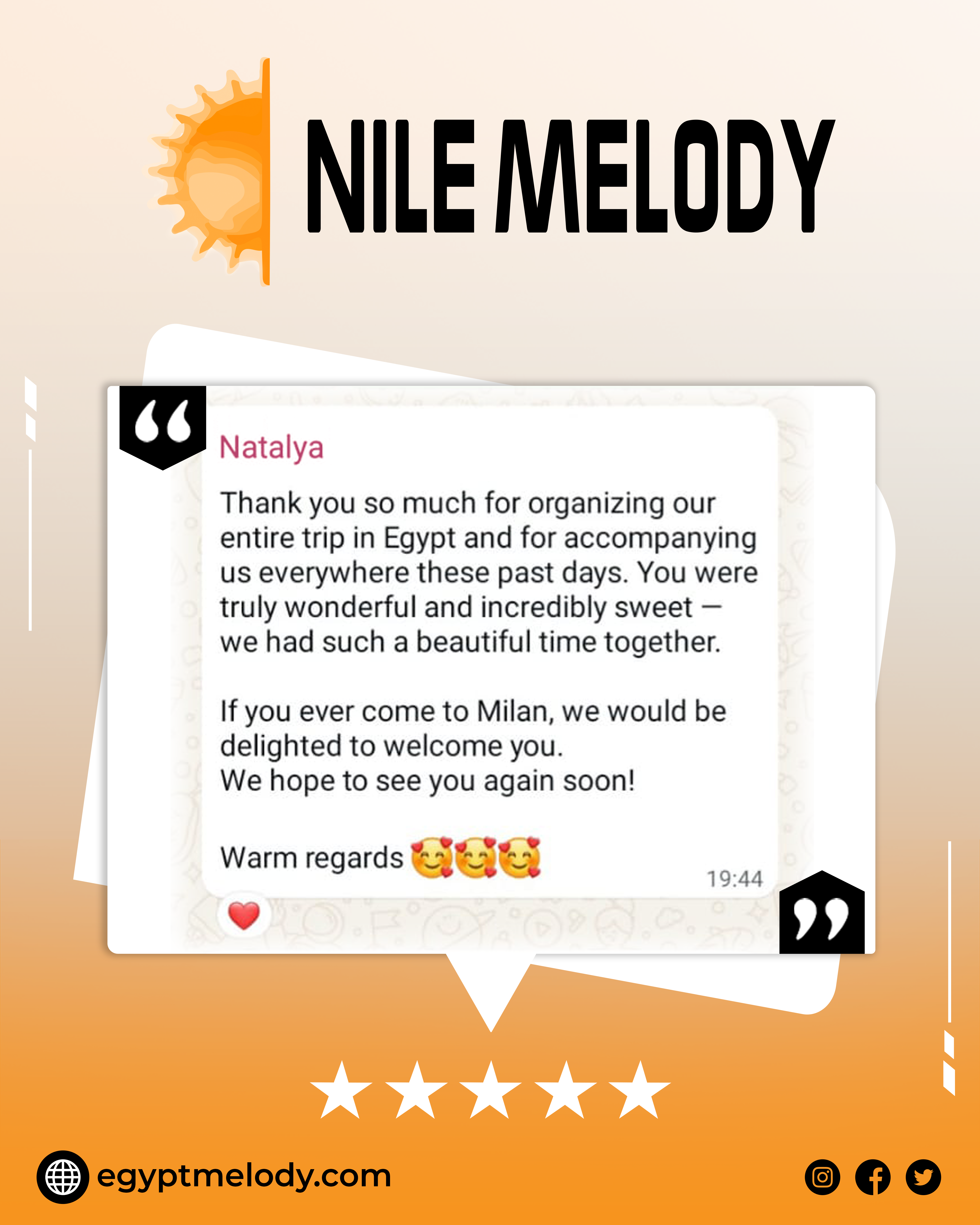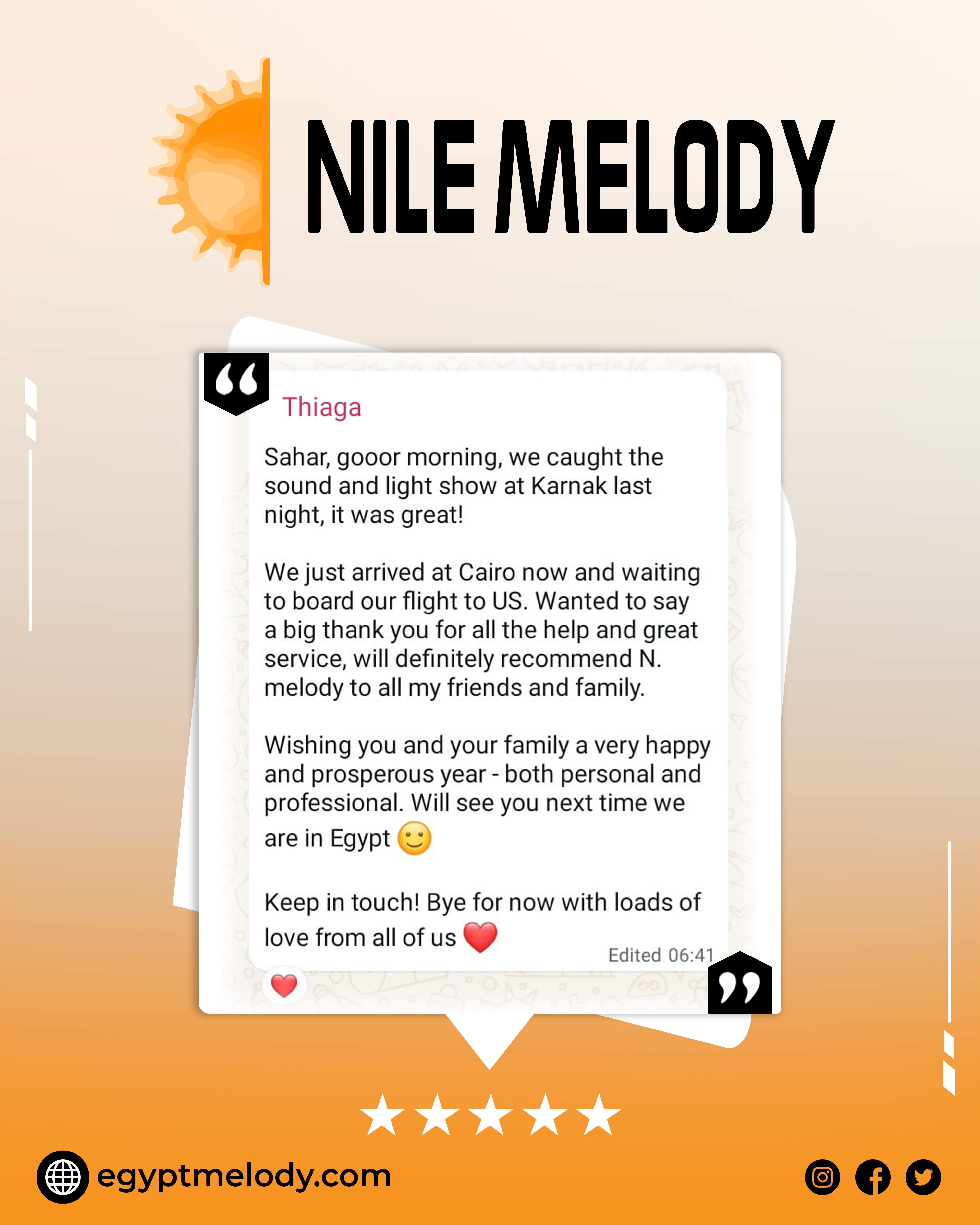 Stay up-to-date with all the latest news, exclusive offers, and exciting travel packages from Nile Melody by subscribing to our newsletter. Whether you're planning your next vacation or just dreaming about future adventures, our newsletter delivers inspiration and insider tips directly to your inbox. Be the first to know about special promotions, travel deals, and new tour options designed to make your Egyptian getaway unforgettable. Sign up today and never miss a chance to explore Egypt with Nile Melody!